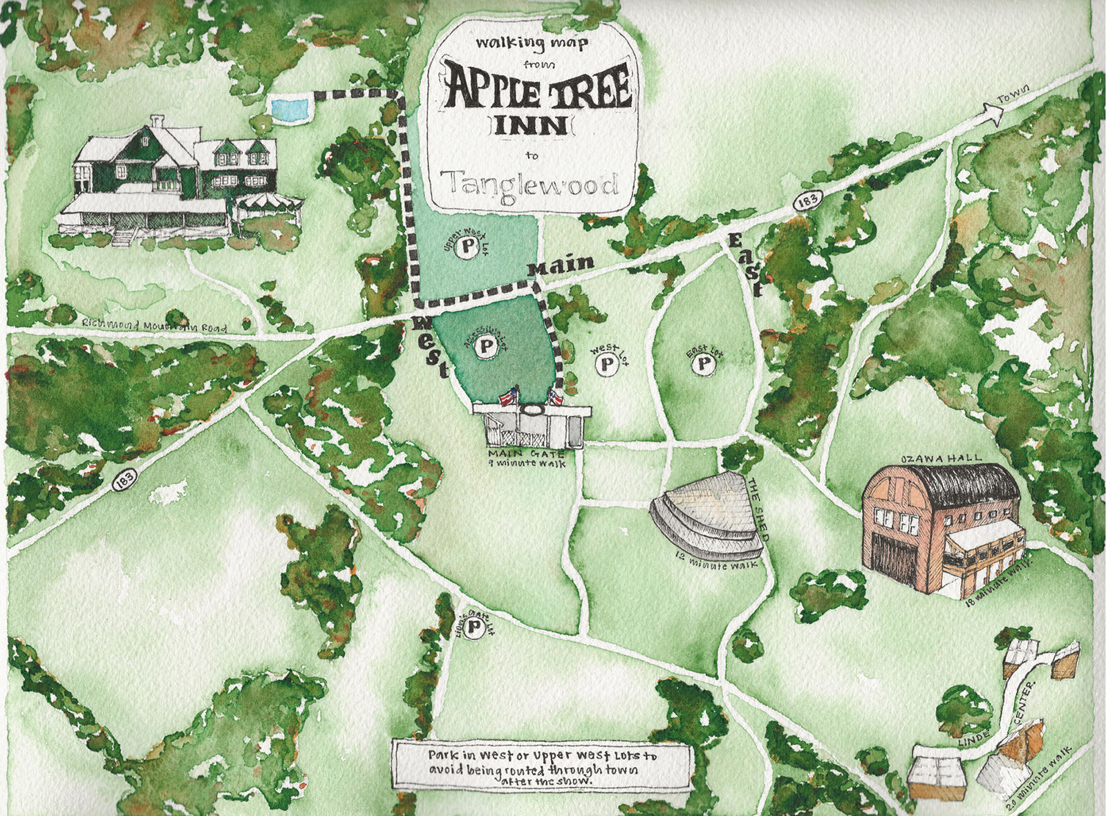 To take full advantage of staying so close, we generally don’t recommend driving somewhere else to get dinner before a show. But if you are driving, we recommend parking in the West or Upper West lots. After the show, Tanglewood traffic cops often make West St. a one-way street, so guests exiting other lots may have to take a detour through town before they get back to the Apple Tree.